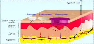 The microneedle patch (MNPs) is a type of transdermal patch which retains the advantages, but reduces the disadvantages of basic transdermal patches. Embedding as many as 102–104 needles per square centimetre of patch, encapsulated or coated with intended drug, MNPs can easily pass skin tissue known as the stratum corneum which is roughly 20 μm in thickness, allowing up to the size of macromolecule to pass.[6] MNPs were developed mainly because transdermal patch can deliver smaller size or micronized molecules such as nicotine and birth control which easily diffuse and penetrate the skin, but lack in delivering macro or large size molecules. The 100–1000 μm needles spread across the patch, making sure people will not feel any discomfort from the patch. There are two types of needles used in MNPs, the first one is non-water-soluble needles made out of metal, ceramic, or polymer, and the second one is water-soluble needles made out of saccharides or soluble polymers.[6]