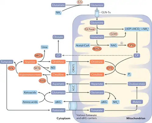 - ↑ 4.0 4.1 4.2 4.3 Roth, K.S. "Genetics of Hyperammonemia". Medscape. Archived from the original on December 23, 2008. Retrieved November 12, 2012.