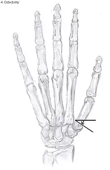 During osteotomy, the metacarpal is cut and a wedge shape bone fragment is removed to move the bone away from the hand.[31] Postoperative, the thumb of the patient is immobilized using a thumb-cast.