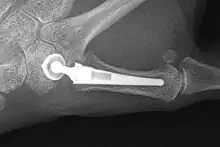 Subluxation of a prosthesis is a complication where the prosthesis is mobile and is partially dislocated. When the prosthesis is fully dislocated it is called a luxation. Both are painful and need revision surgery so the prosthesis can be repaired or removed.[33] When using a prosthesis over a longer period of time, there is a chance of breaking the prosthesis itself. This is due to mechanical wear.