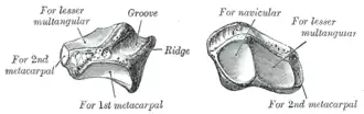 The trapezium is an irregular-shaped carpal bone found within the hand. The trapezium is found within the distal row of carpal bones, and is directly adjacent to the metacarpal bone of the thumb. On its ulnar surface are found the trapezoid and scaphoid bones.[1]:708