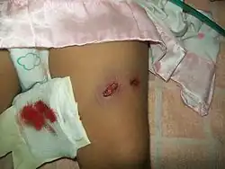 | A gunshot wound to the left thigh showing entry and exit wound of a 3 year old girl. | |