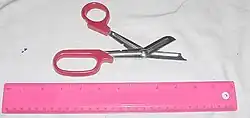 Trauma shears, also known as Tuff Cuts (a brand name), are a type of scissors used by paramedics and other emergency medical personnel to quickly and safely cut clothing from injured people.[1] They usually consist of a plastic handle with a metal blade, which is traditionally bent at about 150 degrees, giving them an unusual appearance as compared to normal scissors, and also a longer lever arm.
