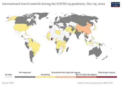 During the COVID-19 pandemic, many countries and regions imposed quarantines, entry bans, or other travel restrictions for citizens of or recent travelers to the most affected areas.[1] Some countries and regions imposed global restrictions that apply to all foreign countries and territories, or prevent their own citizens from travelling overseas.[2]