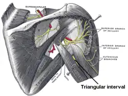 Suprascapular and axillary nerves of right side, seen from behind. Triangular interval is labeled.) | |