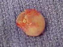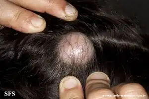 A trichilemmal cyst is a common cyst that forms from a hair follicle, most often on the scalp, and is smooth, mobile and filled with keratin, a protein component found in hair, nails, skin, and horns. Trichilemmal cysts are clinically and histologically distinct from trichilemmal horns, which are much rarer and not limited to the scalp.[3] Rarely, these cysts may grow more extensively and form rapidly multiplying trichilemmal tumors, also called proliferating trichilemmal cysts, which are benign but may grow aggressively at the cyst site.[4] Very rarely, trichilemmal cysts can become cancerous.[5]