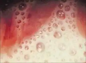 | Micrograph showing a positive result for trichomoniasis. A trichomonas organism is seen on the top-right of the image. | |