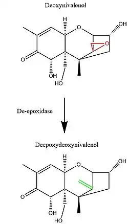 Outside of the strategies for physical and chemical decontamination, advancing research in molecular genetics has also given rise to the potential of a biological decontamination approach. Many microbes, including bacteria, yeast, and fungi, have evolved enzymatic gene products which facilitate the specific and efficient degradation of trichothecene mycotoxins.[73] Many of these enzymes specifically degrade the 12,13 carbon epoxide ring which is important for the toxicity of trichothecenes. For example, the Eubacteria strain BBSH 797 produces de-epoxidase enzymes which reduce the 12,13 carbon epoxide ring to a double bond group.[73] These, along with other microbes expressing trichothecene detoxifying properties, can be used in feed stores to prevent to toxic effect of contaminated feed upon consumption.[70] Furthermore, molecular cloning of the genes responsible for producing these detoxifying enzymes could be useful in producing strains of agricultural products that are resistant to trichothecene poisoning.[70]