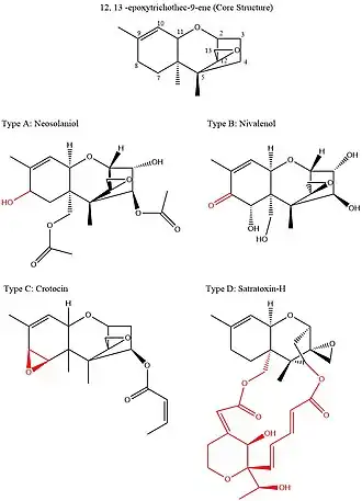 Trichothecenes are a group of over 150 chemically related toxic mycotoxins.[7] Each trichothecene displays a core structure consisting of a six-membered ring containing a single oxygen atom, flanked by two carbon rings.[8] This core ring structure contains an epoxide bridging carbons 12 and 13, as well as a double bond between carbons 9 and 10.[9] These two functional groups are primarily responsible for trichothecenes' ability to inhibit protein synthesis and incur general cytotoxic effects.[10] Notably, this core structure is amphipathic, containing both polar and nonpolar parts.[11] All trichothecenes are related through this common structure but are differentiated by the substitution pattern of oxygen-containing functional groups on carbons 3, 4, 7, 8, and 15.[9] These functional groups govern the properties of an individual trichothecene and also serve as the basis for the most commonly used classification system for this family of toxins. This classification system breaks up the trichothecene family into four groups: Type A, B, C, and D.