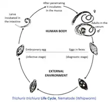 Trichuris trichiura is a roundworm that infects the intestines.[4] It can cause various symptoms and has been known to lead to death. Trichuris trichiura lives in the soil in its egg stage. Once it is ingested, it develops into the larvae stage, finally maturing into the adult stage in the intestines.[5]