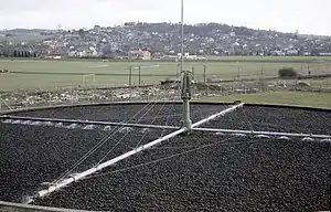 A typical trickling filter is circular and between 10 metres and 20 metres across and between 2 metres to 3 metres deep. A circular wall, often of brick, contains a bed of filter media which in turn rests on a base of under-drains. These under-drains function both to remove liquid passing through the filter media but also to allow the free passage of air up through the filter media. Mounted in the center over the top of the filter media is a spindle supporting two or more horizontal perforated pipes which extend to the edge of the media. The perforations on the pipes are designed to allow an even flow of liquid over the whole area of the media and are also angled so that when liquid flows from the pipes the whole assembly rotates around the central spindle.[1] Settled sewage is delivered to a reservoir at the centre of the spindle via some form of dosing mechanism, often a tipping bucket device on small filters.