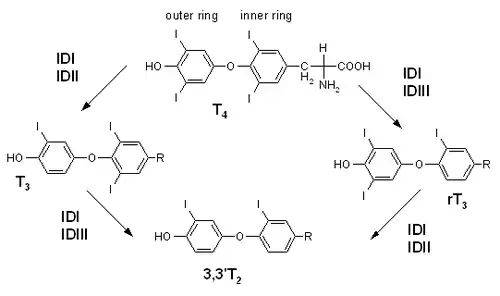 Synthesis of T3 from T4 via deiodination. Synthesis of reverse T3 and T2 is also shown.