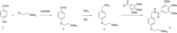 Alkylation of the sodium salt of p-hydroxybenzaldehyde (1) with 2-dimethylaminoethyl chloride affords the ether (2). Reductive amination of the aldehyde in the presence of ammonia gives diamine (3). Acylation of that product with 3,4,5-trimethoxybenzoyl chloride affords trimethobenzamide (4).