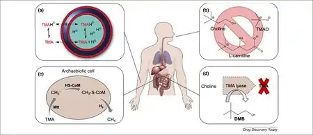 - ↑ 11.0 11.1 Schmidt AC, Leroux JC (2020). "Treatments of trimethylaminuria: where we are and where we might be heading". Drug Discov Today. 25 (9): 1710–1717. doi:10.1016/j.drudis.2020.06.026. PMID 32615074. S2CID 220329737.