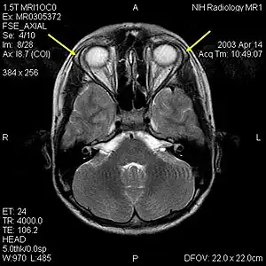 | MRI of the brain of 12-year-old boy with triple-A syndrome showing hypoplastic lacrimal glands (yellow arrows.) | |