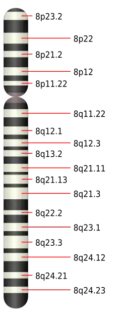 - ↑ Santucci, Kourtney; Malik, Kristina E.; Angione, Katie; Bennink, Dana; Gerk, Andrea; Mancini, Drew; Stringfellow, Megan; Dinkel, Tristen; Demarest, Scott; Miele, Andrea S.; Saenz, Margarita (February 2025). "Chromosome 8p Syndromes Clinical Presentation and Management Guidelines". Clinical Genetics. 107 (2): 169–178. doi:10.1111/cge.14626. ISSN 1399-0004. PMID 39390634.