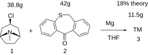 Tropatepine can be synthesized from 3-chlorotropane (1).[2] A Grignard reaction between 3-chlorotropane and dibenzo[b,e]thiepin-11(6H)-one (2) followed by dehydration to the olefin produces tropatepine (3).