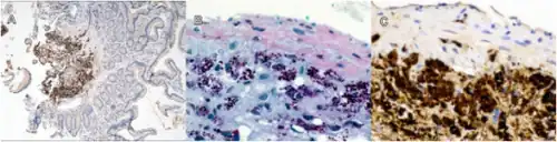 - ↑ Liang Z, La Scola B, Raoult D (January 2002). "Monoclonal antibodies to immunodominant epitope of Tropheryma whipplei". Clin. Diagn. Lab. Immunol. 9 (1): 156–9. doi:10.1128/CDLI.9.1.156-159.2002. PMC 119894. PMID 11777846.