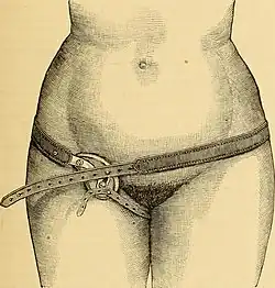 "Eggleston's Truss has a pad different from all others. It is cup-shaped, with a self-adjusting ball in the centre, and adapts itself to all positions of the body, while the ball in the cup presses back the intestines just as a person does with the finger. With light pressure the hernia is held securely day and night, and a radical cure is certain. It is easy, durable and cheap."[2]