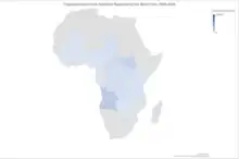 African trypanosomiasis, which is caused by either Trypanosoma brucei gambiense or Trypanosoma brucei rhodesiense, threatens some 65 million people in sub-Saharan Africa, especially in rural areas and populations disrupted by war or poverty. The number of cases has been going down due to systematic eradication efforts: in 1998 almost 40,000 cases were reported but almost 300,000 cases were suspected to have occurred; in 2009, the number dropped below 10,000; and in 2018 it dropped below 1000.[1] Chagas disease causes 21,000 deaths per year mainly in Latin America.[2]