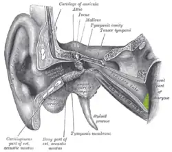 ![]() External and middle ear, opened from the front. Right side. (Tubal tonsil (highlighted).) | |