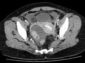 A tubo-ovarian abscess to the person's right of the uterus. The uterus contains an IUD.[14]