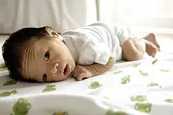 Tummy time is a colloquialism for placing infants in the prone position while awake and supervised to encourage development of the neck and trunk muscles and prevent skull deformations.[1][2][3]