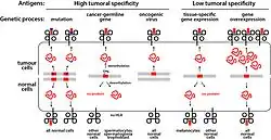 Initially tumor antigens were broadly classified into two categories based on their pattern of expression: Tumor-Specific Antigens (TSA), which are present only on tumor cells and not on any other cell and Tumor-Associated Antigens (TAA), which are present on some tumor cells and also some normal cells.[1]