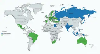 Allylestrenol has been marketed widely throughout the world, including in Europe, Southern, Eastern, and Southeastern Asia, Africa, Oceania, and Latin America.[23][6][24][25] However, although it has been widely marketed in the past, the availability of allylestrenol is relatively limited today.[23][6][24][25] It appears to still be available in Bangladesh, the Czech Republic, Egypt, Hong Kong, India, Indonesia, Japan, Lithuania, Malaysia, the Philippines, Russia, Singapore, and Taiwan.[23][6][24][25] Previously, allylestrenol has also been available in Australia, Austria, Belgium, Brazil, Germany, Greece, Hungary, Italy, Luxembourg, Mexico, Poland, South Africa, Spain, Sweden, Switzerland, Turkey, Ukraine, the United Kingdom, and Yugoslavia (now Serbia and Montenegro).[23][6][24][25] However, it seems to have been discontinued in these countries.[23][6][24][25] It does not seem to have been marketed in the United States or Canada.[23][6][24][25]