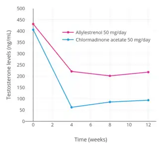 Similarly to other progestogens, allylestrenol has potent antigonadotropic effects.[54] It is able to considerably decrease circulating concentrations of luteinizing hormone, testosterone, and dihydrotestosterone in men.[32][34][39][40] At a dosage of 50 mg/day, allylestrenol has been found to suppress circulating testosterone levels by 78% in men with BPH.[54] This is about the maximum that progestogens are known to be able to suppress testosterone levels in men.[55][56][57] In accordance, the reduction of testosterone and luteinizing hormone levels with allylestrenol in men has been found in a study to be equivalent to that of chlormadinone acetate and oxendolone.[33] However, another study found a significantly lower decrease in testosterone levels with 50 mg/day allylestrenol relative to 50 mg/day chlormadinone acetate of about 49–52% versus 76–85%, respectively.[34] Animal research suggests that allylestrenol produces its beneficial effects in BPH via its antigonadotropic effects and consequent suppression of androgen levels and inhibition of prostate gland growth, similarly to other progestins.[54] Some studies have found that allylestrenol is less effective for BPH than chlormadinone acetate but also produces fewer side effects and sexual dysfunction.[31][34][35] Allylestrenol therapy for BPH is associated with a significant decrease in prostate-specific antigen levels, which may mask the detection of prostate cancer.[54][43]