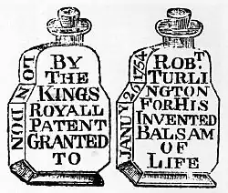 He succeeded in obtaining a royal patent from King George II in 1744, which gave him the right to pursue anyone attempting to pass off their own product as his,[1] one of the earliest medicinal patents.[2][a] In his royal patent application Turlington claimed that his nostrum contained 27 ingredients, and was effective in the treatment of "kidney and bladder stones, cholic, and inward weakness", a list of ailments he greatly expanded upon in a 46-page marketing brochure printed shortly afterwards.[4] Turlington's Balsam quickly became popular in England and in the American colonies.[1]