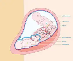 Depending on the number, type and direction of the interconnecting blood vessels (anastomoses), blood can be transferred disproportionately from one twin (the "donor") to the other (the "recipient"), due to a state of "flow imbalance" imparted by new blood vessel growth across the placental "equator", the line that divides each baby's proportion of the shared placenta. This state of transfusion causes the donor twin to have decreased blood volume, retarding the donor's development and growth, and also decreased urinary output, leading to a lower than normal level of amniotic fluid (becoming oligohydramnios). The blood volume of the recipient twin is increased, which can strain the fetus's heart and eventually lead to heart failure, and also higher than normal urinary output, which can lead to excess amniotic fluid (becoming polyhydramnios). The demise of the fetus is typically a result of ischemia related to the lack of blood flow. The lack of blood flow causes bowel atresia, brain damage, and kidney failure.[3]