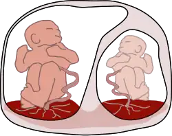 As a result of sharing a single placenta, the blood supplies of monochorionic twin fetuses can become connected, so that they share blood circulation: although each fetus uses its own portion of the placenta, the connecting blood vessels within the placenta allow blood to pass from one twin to the other. It is thought that most monochorionic placentae have these "shared connections" that cross the placenta, with the net flow volumes being equal between them. This state is sometimes referred to as "flow balance". When the placenta has deep vein–artery connection, this can cause blood flow to become unbalanced.[4]