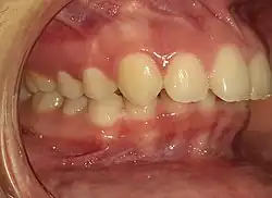 In Angle's classification system for malocclusion, a Class II bite (Figure 1) occurs when the lower jaw (mandible) is positioned more behind relative to the upper jaw (maxilla). This misalignment means that when the teeth come together, the lower teeth bite significantly behind the upper teeth[2] creating a large horizontal gap between upper and lower teeth. It is defined as increased overjet, which is measured from the labial surface of the tips of the upper incisors to the labial surface of the lower incisors horizontally.[3]