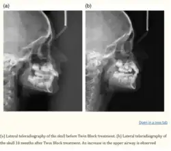 - ↑ Sharma, Ak; Sachdev, V; Singla, A; Kirtaniya, Bc (2012). "Skeletal and Dentoalveolar changes concurrent to use of Twin Block appliance in Class II division I cases with a deficient mandible: A cephalometric study". Journal of Indian Society of Pedodontics and Preventive Dentistry. 30 (3): 218–226. doi:10.4103/0970-4388.105014. ISSN 0970-4388. PMID 23263425.