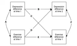 As may be seen in the next Figure, this design can be extended to multiple measurements, with consequent increase in the kinds of information that one can learn. This is called a cross-lagged model (multiple traits measured over more than one time).[27]