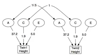 An example structural model (for the heritability of height among Danish males)[20] is shown: