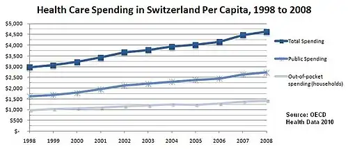 This graph contrasts total health care spending with public spending, in US dollars adjusted for purchasing power parity in Switzerland.