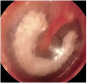 Tympanosclerosis is a condition caused by hyalinization and subsequent calcification of subepithelial connective tissue of the tympanic membrane and middle ear, sometimes resulting in a detrimental effect to hearing.[1][2]
