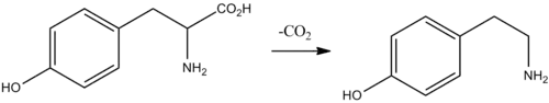 Biochemically, tyramine is produced by the decarboxylation of tyrosine via the action of the enzyme tyrosine decarboxylase.[52] Tyramine can, in turn, be converted to methylated alkaloid derivatives N-methyltyramine, N,N-dimethyltyramine (hordenine), and N,N,N-trimethyltyramine (candicine).