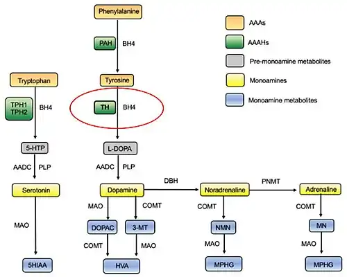 | Simplified overview of the biosynthesis and catabolism of serotonin and the catecholamines, with tyrosine hydroxylase (TH) and its cofactor tetrahydrobiopterin (BH4) circled in red. Note that different parts of these processes take place in different tissues. Abbreviations: 3-MT, 3-methoxytyramine; 5-HTP, 5-hydroxytryptophan; 5HIAA, 5-hydroxyindolacetic acid; AAAHs, aromatic amino acid hydroxylases; AAAs, aromatic amino acids; AADC, aromatic acid decarboxylase; BH4, (6R)-L-erythro-5,6,7,8-tetrahydrobiopterin; COMT, catechol-O-methyltransferase; DBH, dopamine beta-hydroxylase; DOPAC, 3,4-dihydroxyphenylacetic acid; HVA, homovanillic acid; L-DOPA, L-3,4-dihydroxyphenylalanine; MN, metanephrine; MAO, monoamine oxidase; MPHG, 3-methoxy-4-hydroxyphenylethylene glycol; NMN, normetanephrine; PAH, phenylalanine hydroxylase; PLP, pyridoxal phosphate; PNMT, phenylethanolamine N-methyltransferase; TH, tyrosine hydroxylase; TPH, tryptophan hydroxylase. From a review by Gyrid Nygaard et al., 2021.[1] |