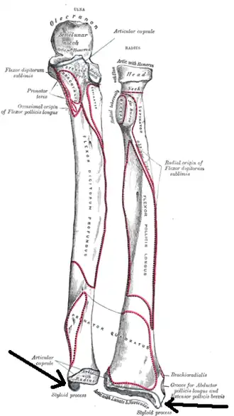 ![]() Bones of left forearm seen from front (ulnar styloid process labeled at bottom left) | |