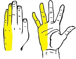 | Cartoon depiction of classic ulnar sensory distribution, including mid-4th and 5th fingers. Note that this diagram does not portray hand muscles affected by ulnar neuropathy. | |