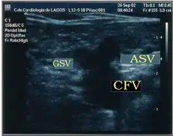 The accessory saphenous vein (ASV), either anterior or posterior, is an important GSV collateral frequently responsible for varicose veins located on the anterior and lateral aspect of the thigh.[27] The anterior ASV is more anterior than the ASV and is outside the femoral vessels plan. The two veins terminate in a common trunk near the groin, the sapheno-femoral junction. Here, the ASV can be located aligned with the femoral vessels at the "alignment sign".[34] Also, at the groin it can be seen at the outside of the great saphenous vein, and together with the common femoral vein (CFV) these three create an image, the so-called "Mickey Mouse sign". Some authors, inspired by this sign (presented for the first time at CHIVA's 2002 meeting in Berlin), described a "Mickey Mouse view" at the groin, an image formed by the common femoral vein, the GSV and the superficial femoral artery. When the ASV is incompetent, its flow becomes retrograde and tries to drain in the superior fibular perforator, at the side of the knee, or sometimes it runs down towards the ankle to drain in the inferior fibular perforator.[37]
