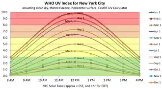 Typical variation of UV index by time of day and time of year, around 40.71 -74.01, based on FastRT UV Calculator[4]