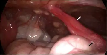 | Urachal sinus white arrow was seen attached to anterior surface of sigmoid colon arrow | |