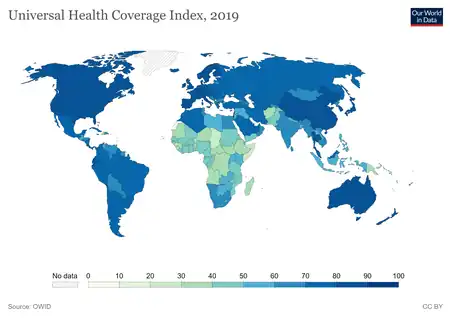 Universal healthcare does not imply coverage for all cases and for all people – only that all people have access to healthcare when and where needed without financial hardship. Some universal healthcare systems are government-funded, while others are based on a requirement that all citizens purchase private health insurance. Universal healthcare can be determined by three critical dimensions: who is covered, what services are covered, and how much of the cost is covered.[2] It is described by the World Health Organization as a situation where citizens can access health services without incurring financial hardship.[3] Then-Director General of the WHO Margaret Chan described universal health coverage as the "single most powerful concept that public health has to offer" since it unifies "services and delivers them in a comprehensive and integrated way".[4] One of the goals with universal healthcare is to create a system of protection which provides equality of opportunity for people to enjoy the highest possible level of health.[5] Critics say that universal healthcare leads to longer wait times and worse quality healthcare.[6]