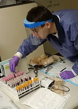 - ↑ CDC. Update: universal precautions for prevention of transmission of human immunodeficiency virus, hepatitis B virus, and other bloodborne pathogens in health-care settings. MMWR Morb Mortal Wkly Rep 1988;37(24):377-82, 87–8.