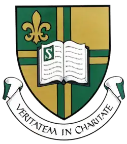 Université de Sherbrooke's arms, supporters, flag, and badge were registered with the Canadian Heraldic Authority on January 15, 2004.[4] Université de Sherbrooke's crest and Supporters were registered with the Canadian Heraldic Authority on April 20, 2007.[5] The motto of the school is Veritatem in Charitate ("Truth through charity").
