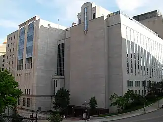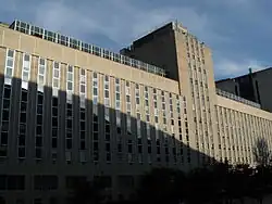 Originally residing in Pennsylvania Hall and Allen Hall, ground was broken on a new School of Medicine building on June 28, 1954[38] and it opened in 1956. Construction of the building, designed by the architectural firm Schmidt, Garden and Erickson, was interrupted by a fire in June, 1955 that destroyed girders and concrete work.[39] The School of Medicine began relocating to the facility from Pennsylvania and Allen halls in the fall of 1955.[40] The ten-story structure's original construction costs were $15 million ($176.1 million today). By 1958, the building received its current moniker in honor of one of the school's primary benefactors. The building is attached to UPMC Presbyterian Hospital and contains classrooms, lecture halls, laboratories, and the Falk Library of the Health Sciences.[41] In 2023, seven-story addition to the west wing of Scaife Hall was completed.[42]
